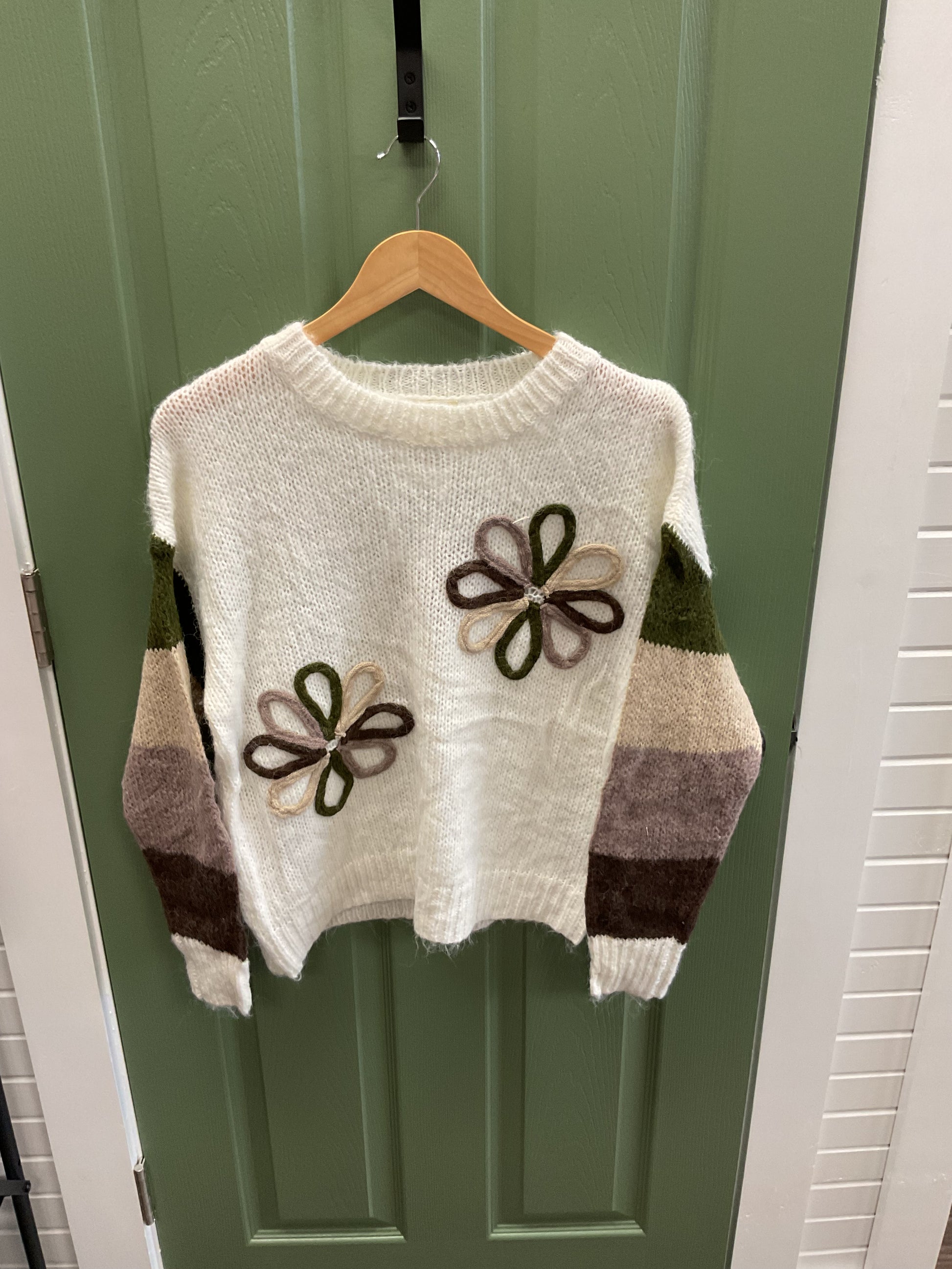 CREAM SWEATER W/FLOWERS AND STRIPED SLEEVE